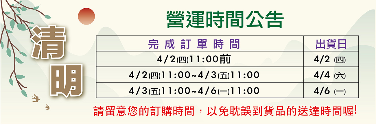 週二AM11:00結單,週五出貨;週五AM11:00結單,下週二出貨
