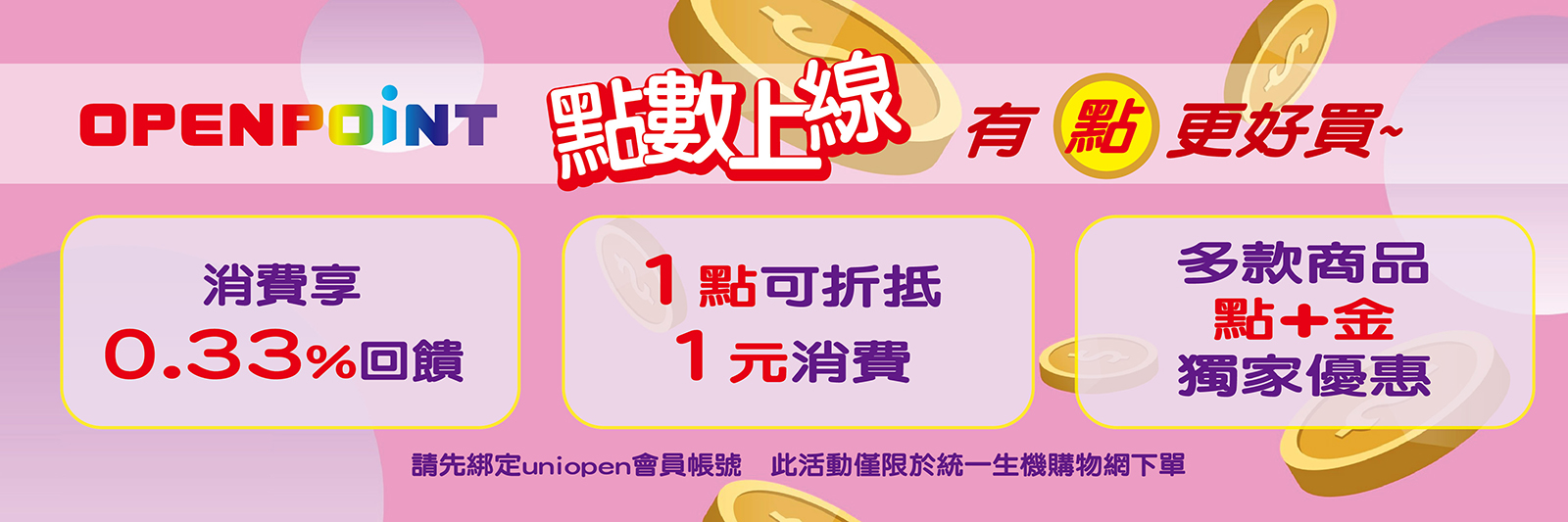 2. 消費點數回饋0.33%,每次累積點數將採小數點第2位,第3位四捨五入,例如支付2元,計算方式為2元*0.33%=0.0066點,取小數點第2位,故實際應贈點0.01點。(單筆消費滿2元才會給點),點數是以購物網下單訂單金額扣除購物金、OPENPOINT點數及其它折扣後的付款金額計算。