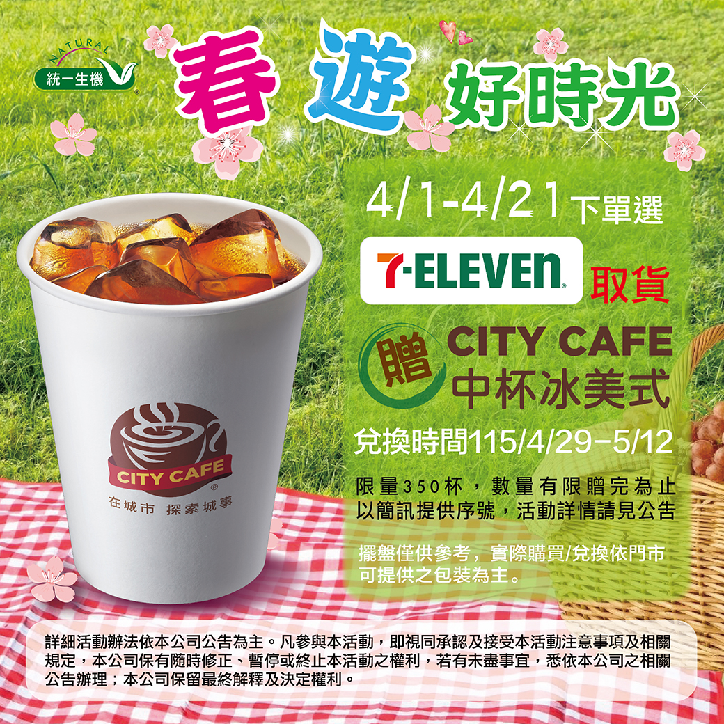 統一生機x 7-ELEVEN期間限定。4/1-4/21超商取貨送中杯冰美式