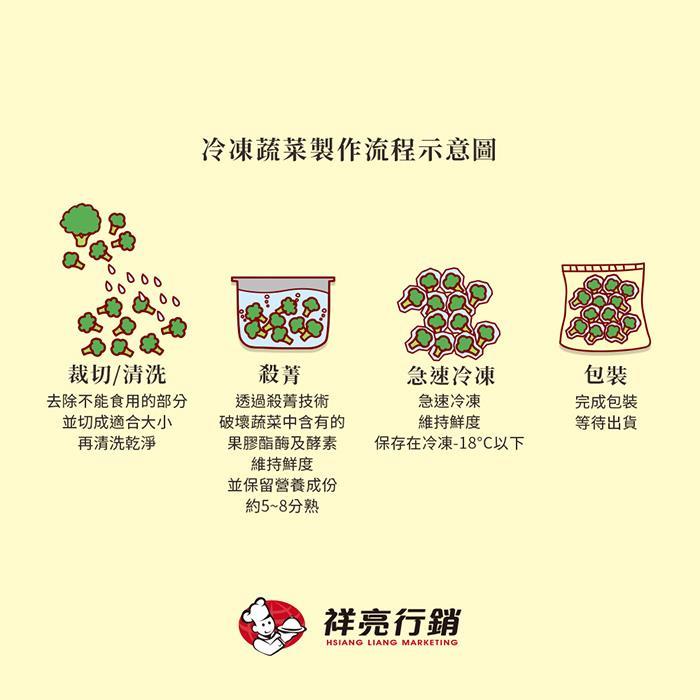 冷凍蔬菜經過殺菁處理,約5-8分熟狀態,須充分加熱才能食用,可微波、快炒、汆燙,不須過度烹調保留蔬菜營養。