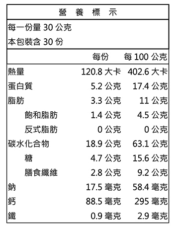 過敏原資訊:本產品含大豆、含麩質之穀物、芝麻、堅果及牛奶製品。