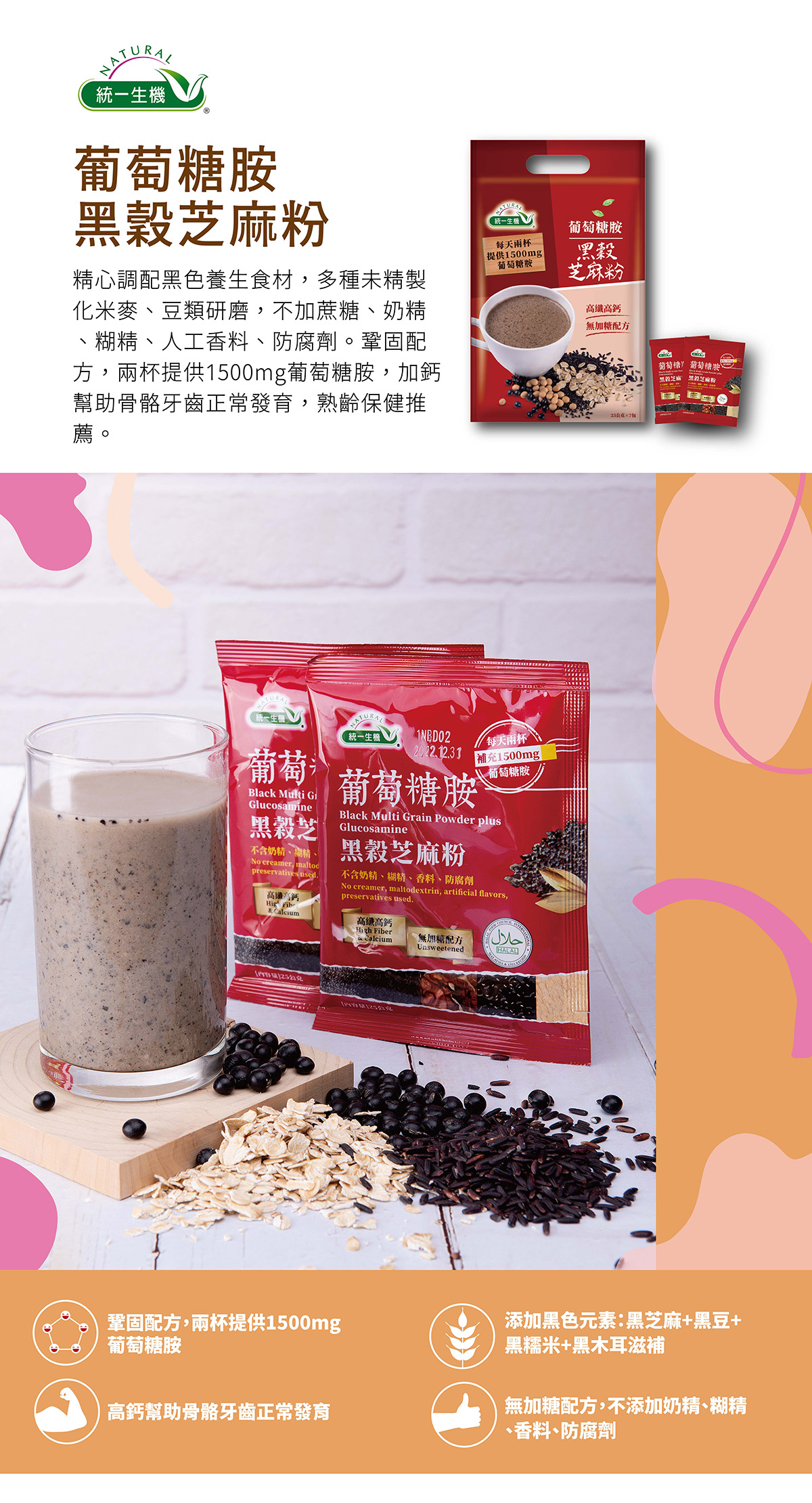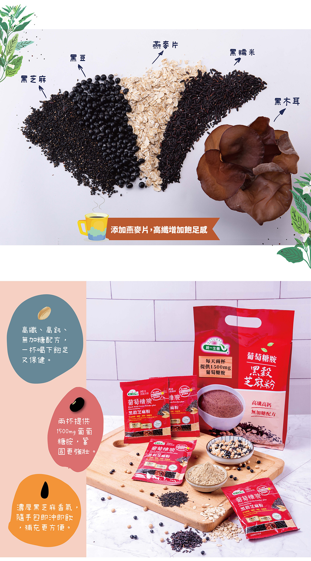 原料: 燕麥粉、黑芝麻、非基因改造黃豆、豆漿粉、燕麥片、黑豆、葡萄糖胺鹽酸鹽、黑糯米、碳酸鈣、黑木耳粉(黑木耳、食鹽)