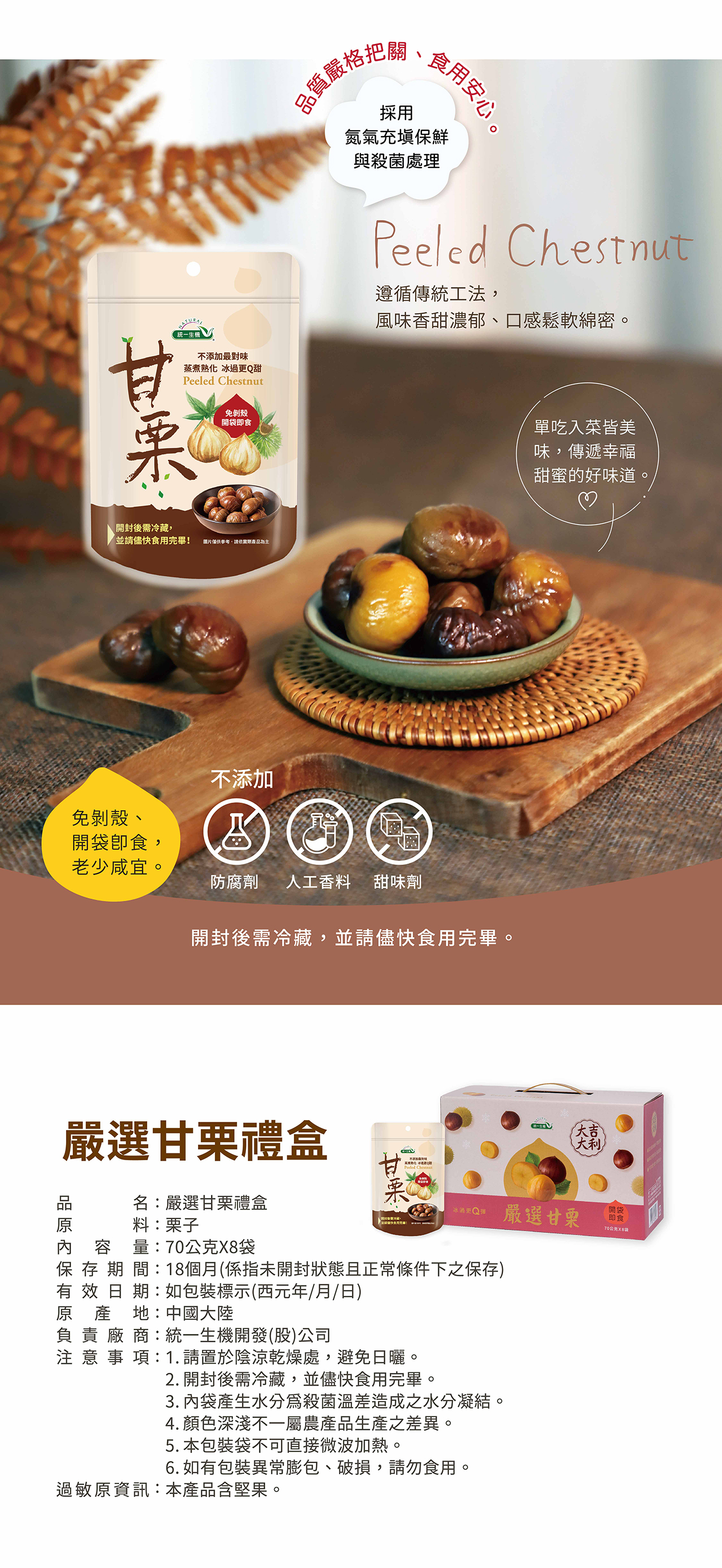 堅持不添加防腐劑、人工色素和甜味劑,保留甘栗風味和營養價值。