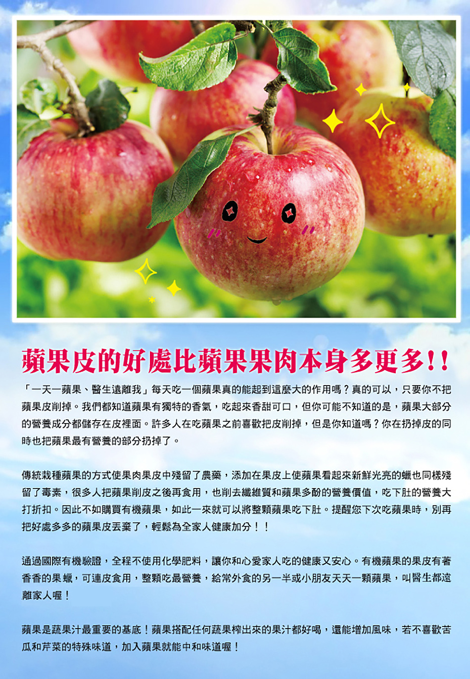 有機蘋果全程有機栽種,在栽培過程中不施用農藥、化學肥料、除草劑及生長激素,口感香甜多汁,帶點微酸濃郁的蘋果香,經由有機機構核可。有機蘋果果皮不上人工果蠟,只要簡單清洗過後整顆有機蘋果可連皮吃,表皮上的光澤為蘋果自然分泌之果蠟,可連皮食用喔!