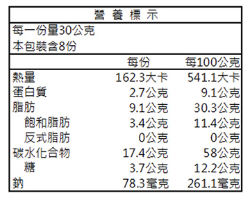 過敏原資訊:本產品含芝麻、大豆及含麩質之穀物的製品