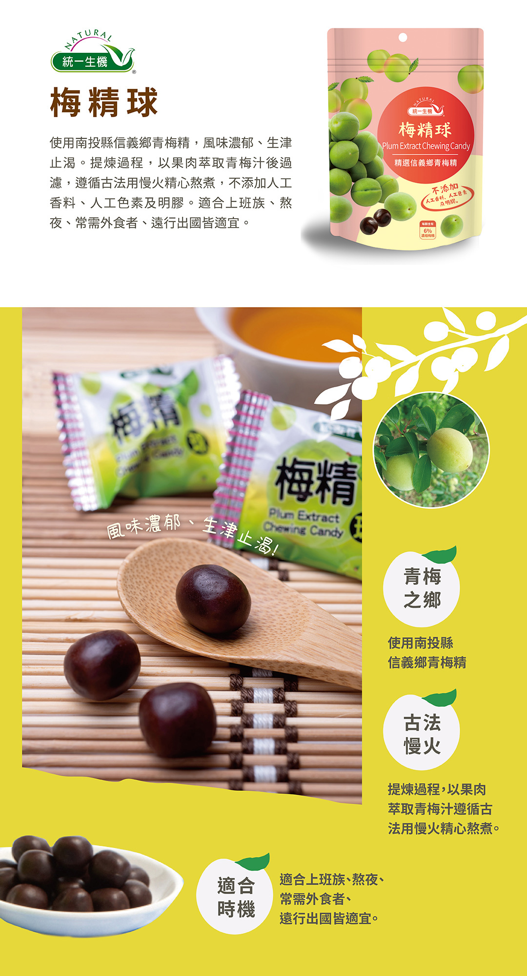 提煉過程以果肉萃取青梅汁後過濾,遵循古法用慢火精心熬煮,不添加人工香料、人工色素及明膠。 適合上班族、熬夜、常需外食者、遠行出國皆適宜。