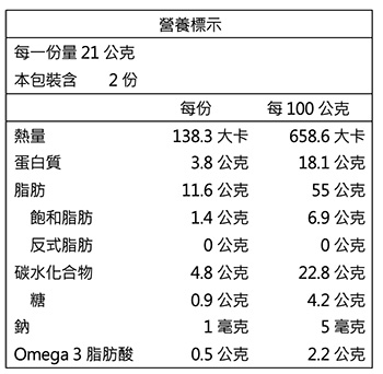 V每份21公克,含OMEGA 3 脂肪酸0.5 公克