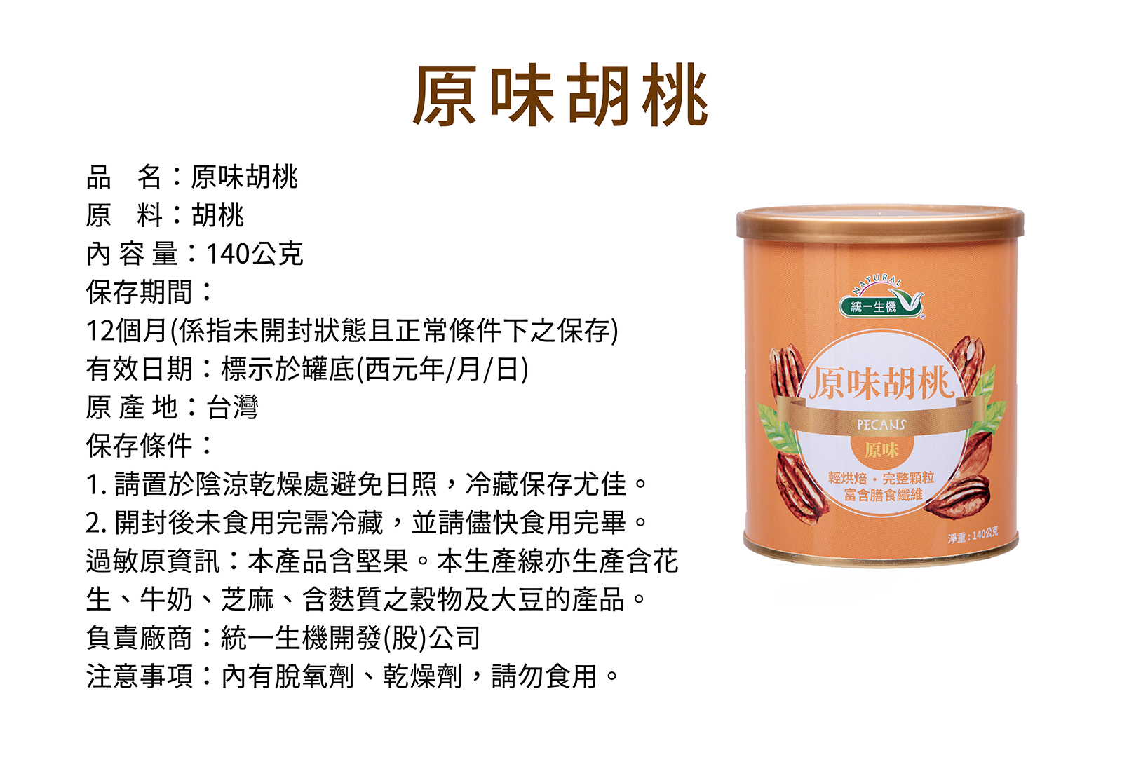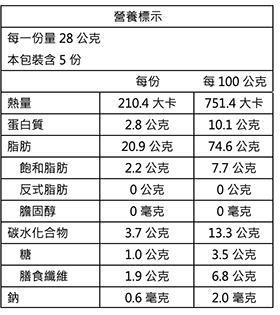 過敏原資訊: 本產品含堅果。本生產線亦生產含花生、牛奶、芝麻、含麩質之穀物及大豆的產品。