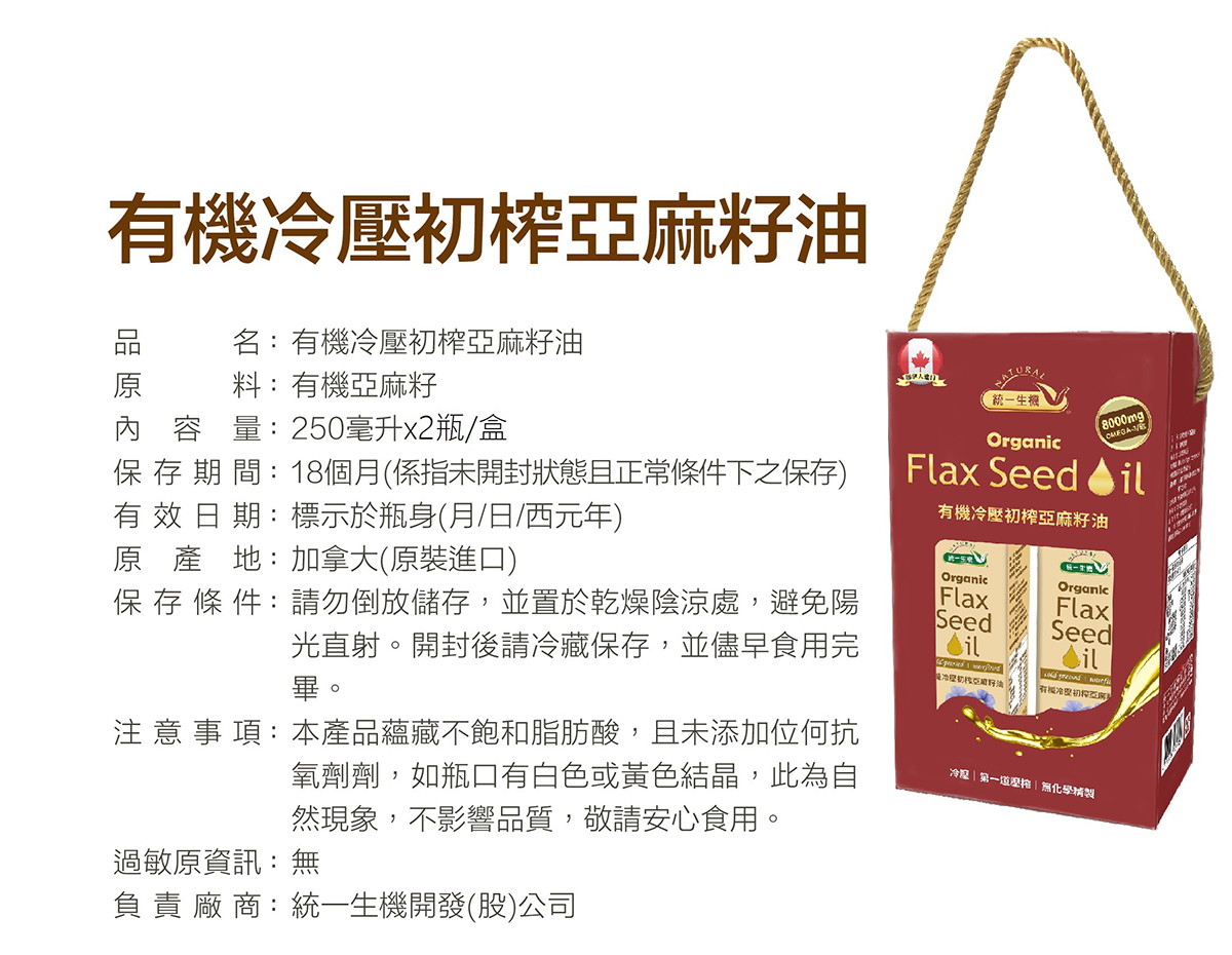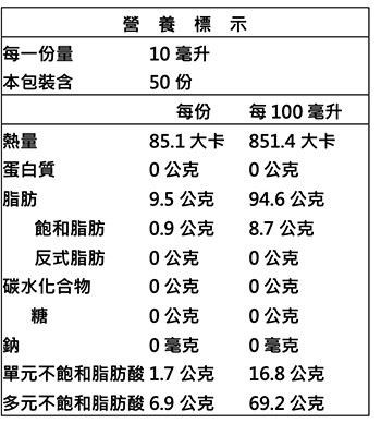 2. 本產品蘊藏不飽和脂肪酸,且未添加任何抗氧化劑,如瓶口有白色或黃色結晶,此為自然現象,不影響品質,敬請安心食用。