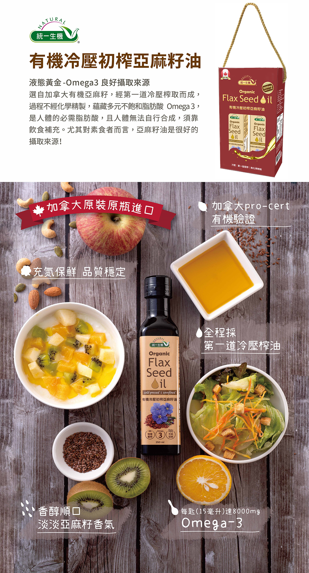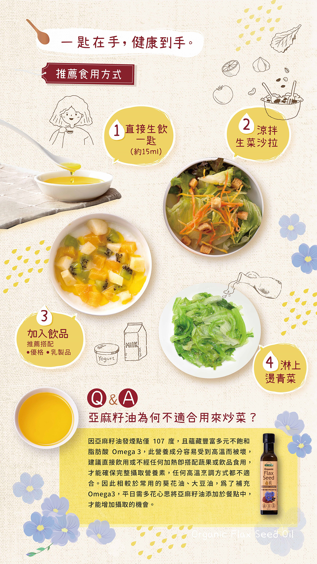 全程維持冷壓榨油,不摻其他油品,不經化學精製,不添加防腐劑,保留有機亞麻籽的原始營養價值。蘊藏多元不飽和脂肪酸Omega-3,是植物中優良的次亞麻油酸攝取來源。