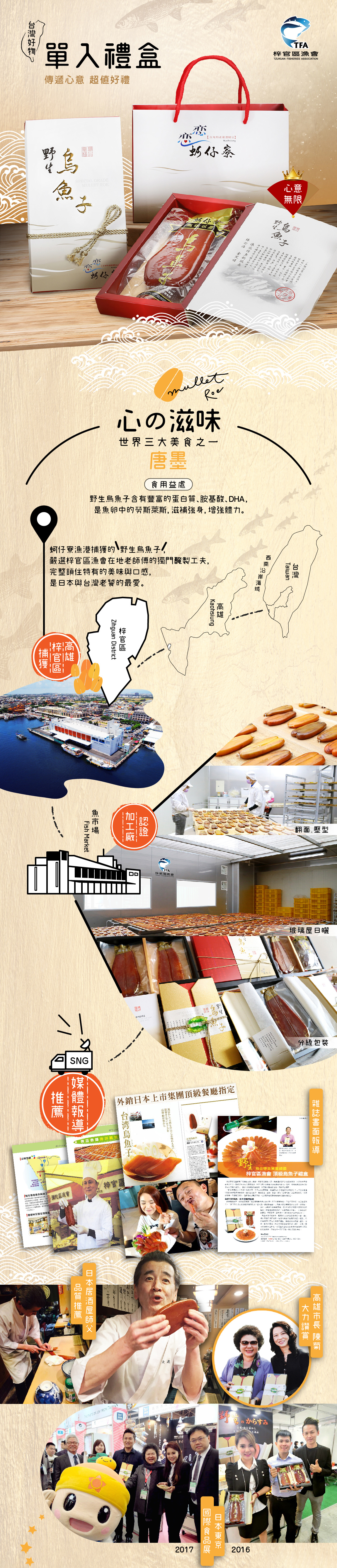 嚴選台灣野生烏魚子魚卵,老師傅依循古法手工清洗,鹽漬,再經反覆日曬與壓型,風味質感絕佳。烏魚子口感細緻多元、營養豐富,更是您佳節送禮的最佳選擇!