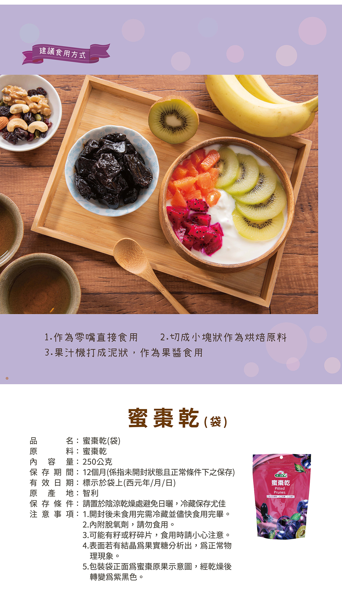 3.包裝袋正面為蜜棗原果示意圖,經乾燥後轉變為紫黑色。