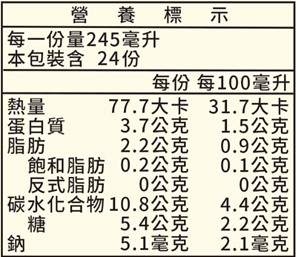 過敏原資訊:本產品含大豆及含麩質之穀物。